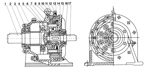 在輸入軸上裝有一個錯位 180 ° 的雙偏心套,在偏心套上裝有兩個稱為轉臂的滾柱軸承,形成 H 機構、兩個擺線輪的中心孔即為偏心套上轉臂軸承的滾道,并由擺線輪與真齒輪上一組環形排列的針齒相嚙合,以組成齒差為一齒的內嚙合減速機構,(為了減小摩擦,在速比小的減速機中,針齒上帶有針齒套)。