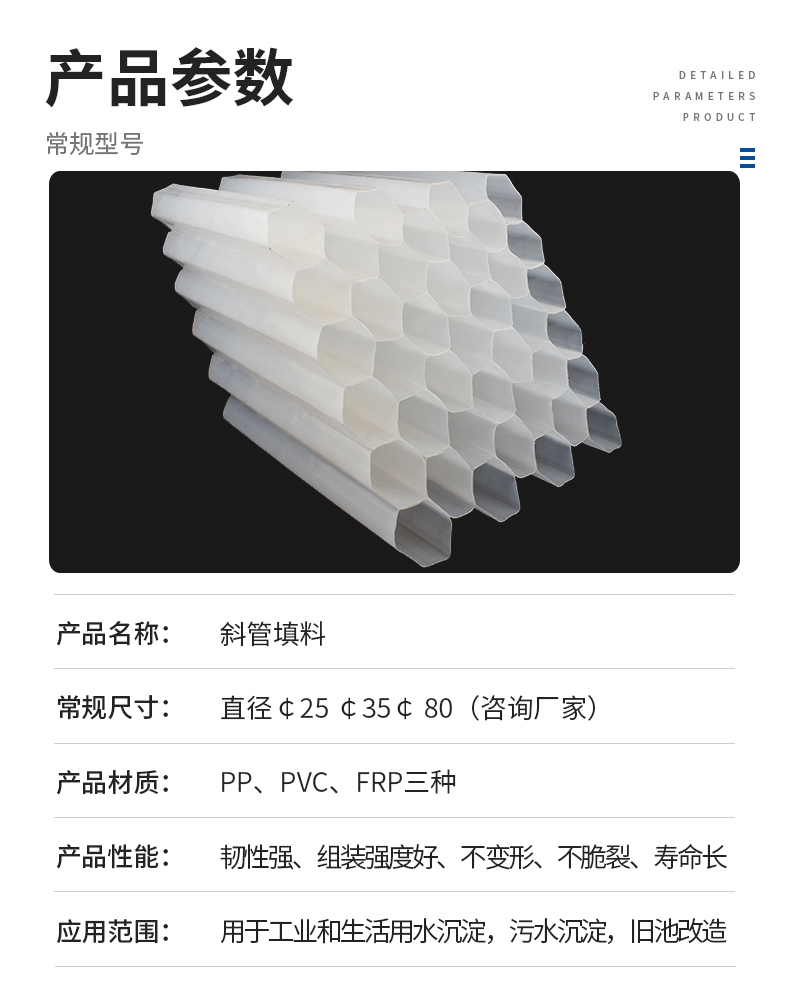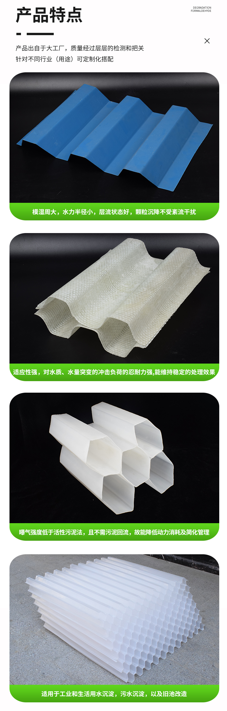 斜管和斜板材質(zhì)都一樣有聚丙烯、乙丙共聚、聚氯乙烯三種。主要用于各種沉淀和除砂作用。是目前在給水排水工程中采用廣泛而且成熟的一項水處理裝置。它適用范圍廣、處理效果高、占地面積小等優(yōu)點。適用進(jìn)水口除砂一般工業(yè)和生活給水沉淀,污水沉淀,隔油以及尾礦濃縮等處理,即適用于新建工程又適用于現(xiàn)有舊池的改造,均能取得良好的經(jīng)濟(jì)效益。