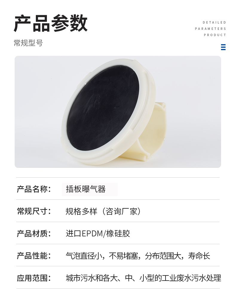 插板曝氣器由底盤、布?xì)獗P、合成橡膠膜片、壓固圓環(huán)、空氣導(dǎo)流板、連接底座與配氣管連接的連接件組成。底座由ABS塑料制成,底座與壓固圓環(huán)上均有螺紋,EPDM橡膠膜片覆蓋在空氣均流板上,在固定圈的作用下能保證在膜片(周圍不漏氣,橡膠膜片在有均勻分布的孔眼,該種橡膠膜片采用多道特殊工藝加工而成,其性能穩(wěn)定,耐中濃度酸、堿、油等介質(zhì)。