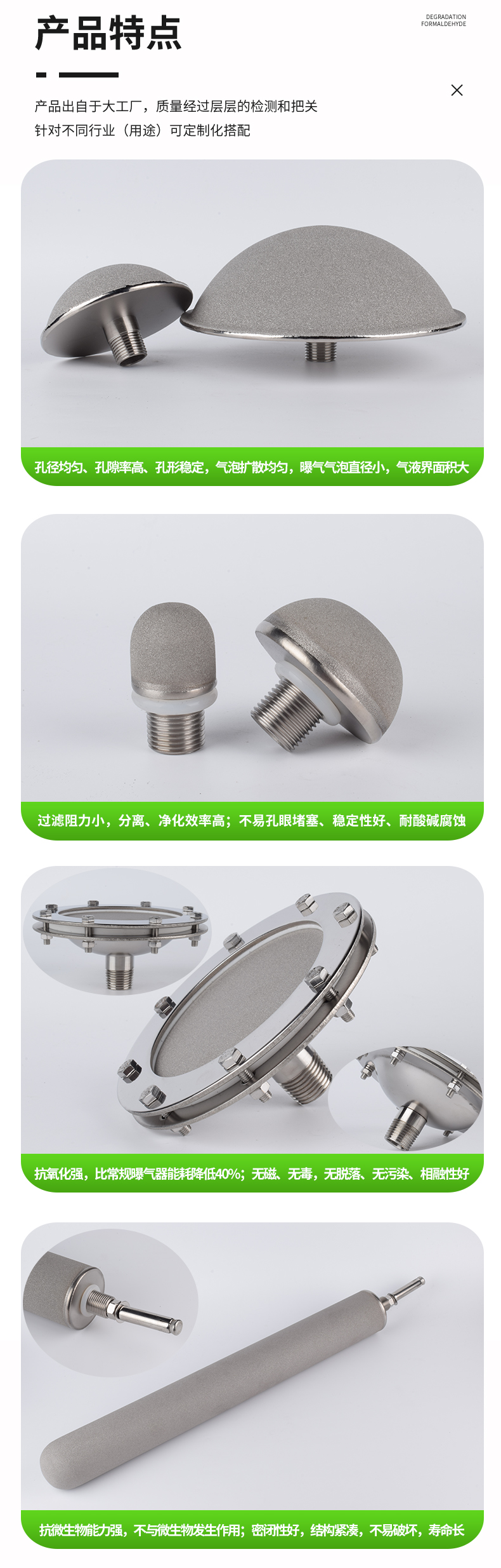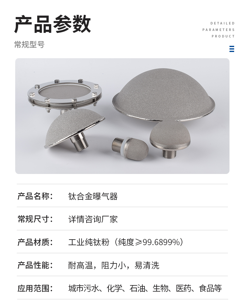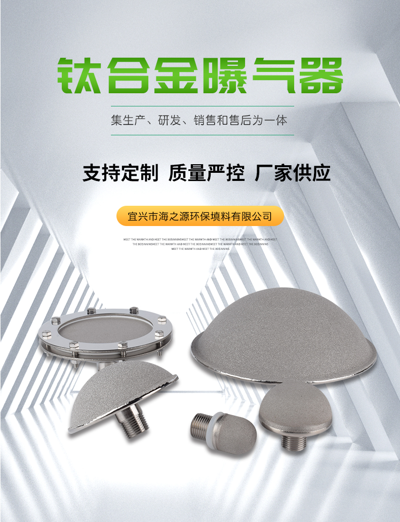 鈦合金曝氣器是以工業純鈦粉(純度≥99.6899%)為主要原料,經過純鈦金屬粉末真空燒結而形成的多孔材料,再經過不同的組合方式制作而成的曝氣裝置。