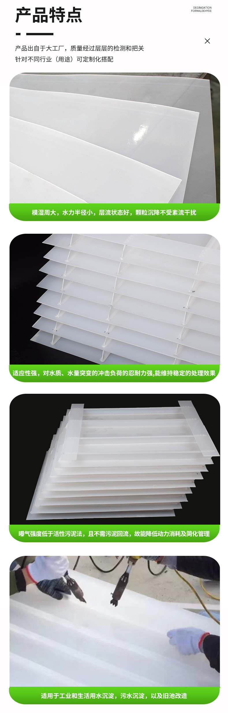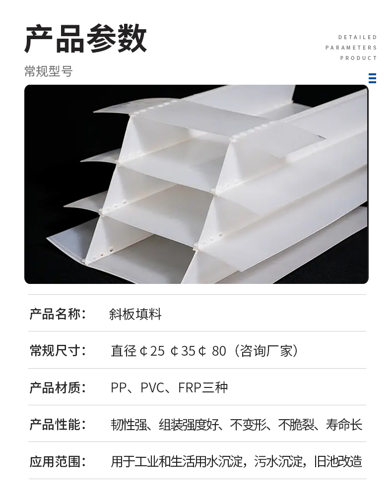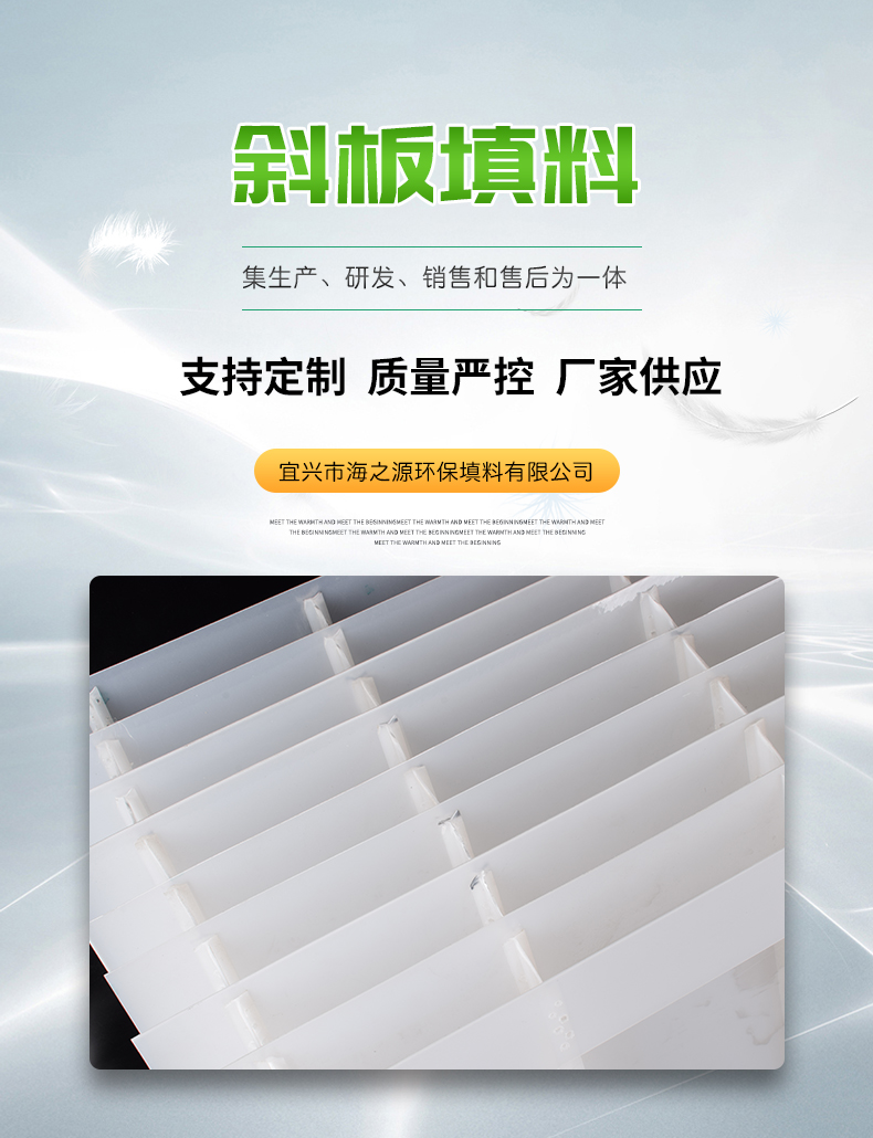 斜板填料、乙丙共聚斜板填料、小間距斜板填料主要由乙丙共聚材料加工制成。在淺層理論的基礎上,在斜板上部設置沉淀距離合理的沉淀段,在下部控制斜板的幾何形狀,使斜板下部形成穩定的接觸絮凝段,通過接觸作用和淺池沉淀機理達到礬花與水分離的目的。 斜板填料按構造型式可分為:①小間距斜板填料  ②接觸絮凝斜板填料  ③復合斜板填料。