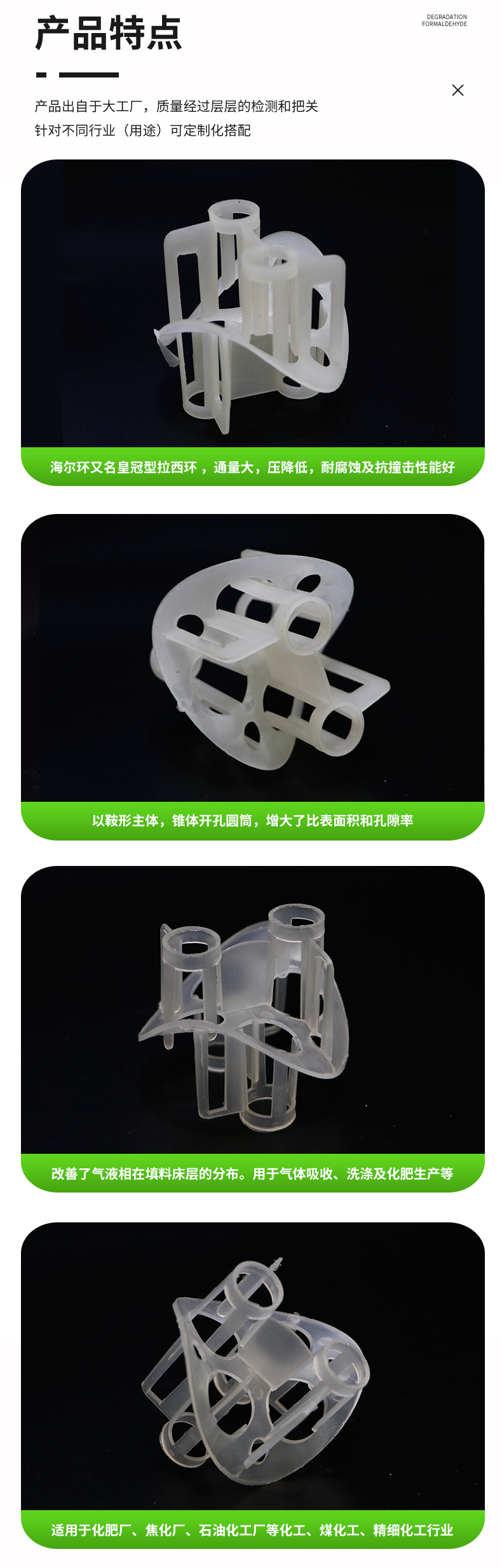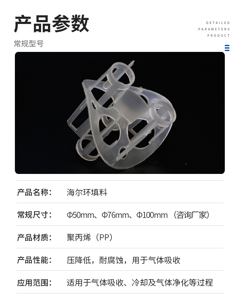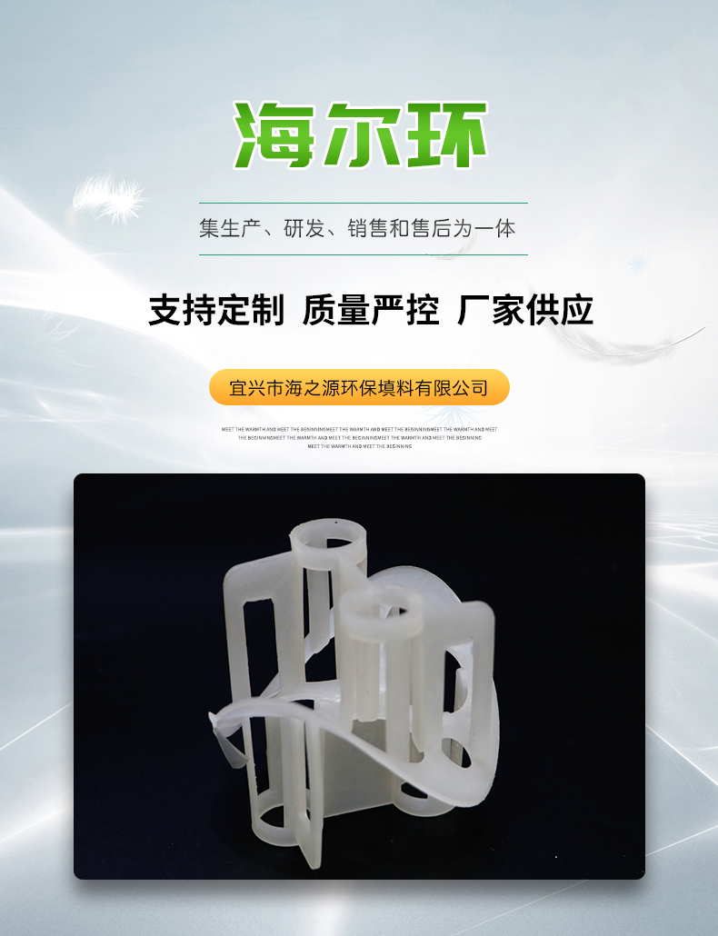 聚丙烯海爾環填料主要采用聚丙烯的化學穩定性很好,除能被濃硫酸及濃硝酸侵蝕外,對其他各種化學試劑都比較穩定,同時它的化學穩定性隨結晶度的增加還有所提高。產品經注塑成復雜結構的優點,以鞍形為主體,錐體開孔圓筒,增大了比表面積和孔隙率,改善了氣液在填料層的分布。產品具有低壓降、填料層氣液分布均勻,抗污性強。